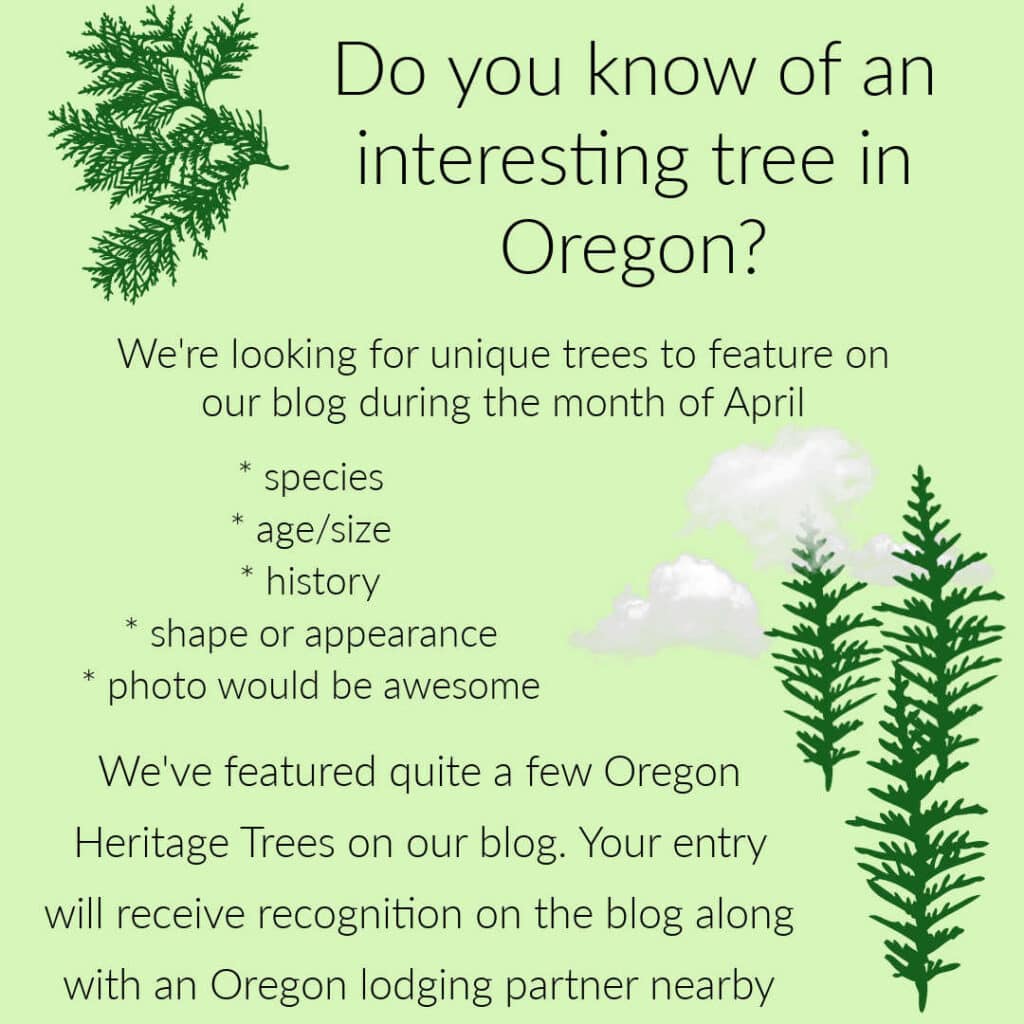 In Oregon, the entire month of April is recognized as Oregon Arbor Month, with the first full week often recognized as Arbor Week. Oregon extends the celebration to the whole month to accommodate better planting conditions across the state. The Oregon Association of Independent Inns will take the opportunity to recognizes our unique, magnificent trees throughout the month of April. Many of these trees, but not all, have been recognized as Oregon Heritage Trees.