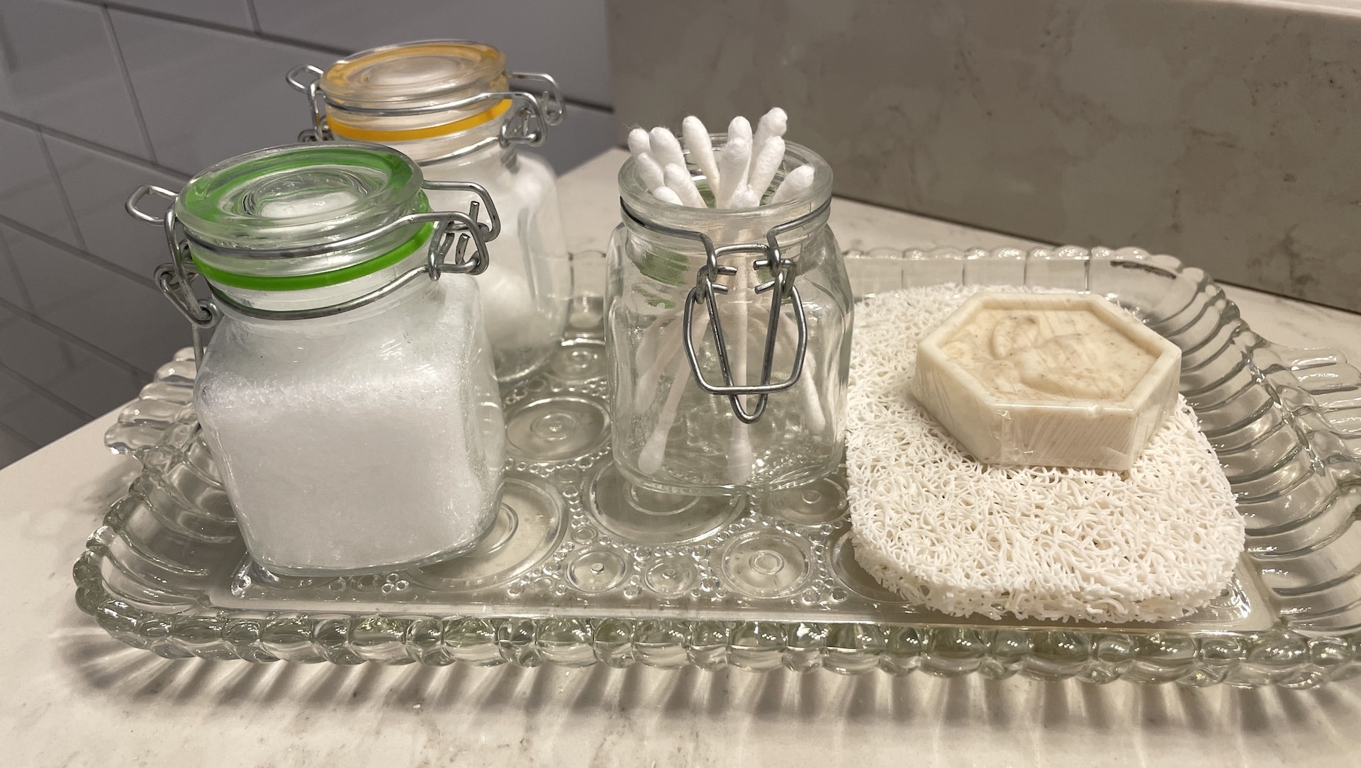 glass tray with toiletries and soap